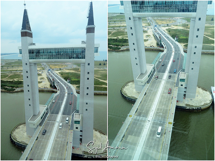 Bahagian daun kembar Jambatan Angkat (jambatan Bascule) ini akan dibuka bila kapal yang tingginya melebihi 12.5 meter hendak lalu di bawahnya. Bila dibuka sepenuhnya, tidak ada halangan ketinggian bagi kapal-kapal yang lalu. Kami diberitahu kalau ada kapal nak lalu, notis 24 jam perlu diberi kepada pihak pengurusan Jambatan Angkat dan pihak Maritim. Sebenarnya memang sangat jarang ini berlaku buat masa ini. Selalunya kapal tinggi yang lalu adalah milik syarikat-syarikat Oil & Gas dan ia akan diiring oleh kapal Maritim Malaysia bila lalu di bawah jambatan. Waktu dan masa laluan bergantung kepada makluman di media sosial Facebook dan Instagram Jambatan Angkat.