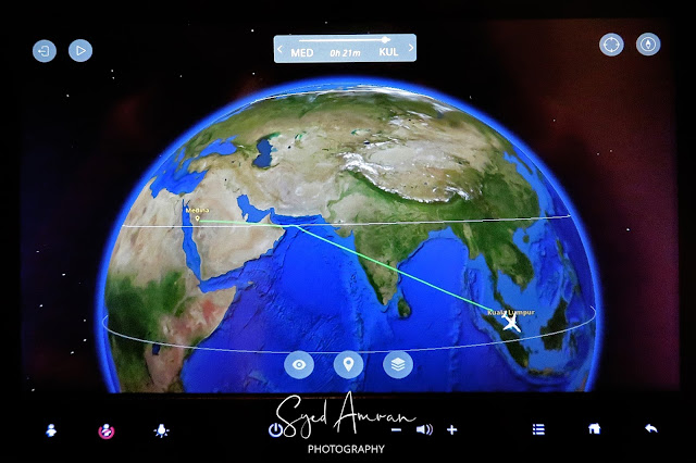Disebabkan penerbangan ini merentas 4 zon waktu dalam perjalanan menuju ke Kuala Lumpur, kami terpaksa menunaikan solat dalam pesawat. Waktu Maghrib masuk sewaktu kami terbang di Laut Arab selepas meninggalkan Oman.