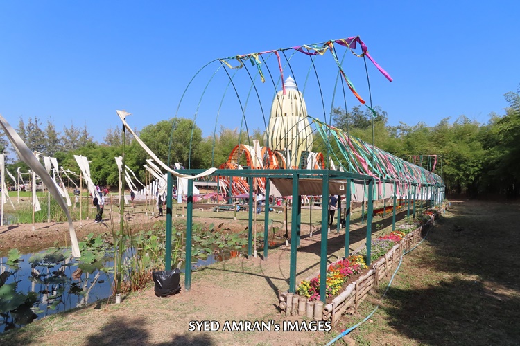 Taman-taman dengan kolam teratai, tanaman pokok-pokok bunga dan hiasan helaian-helaian fabrik berwarna-warni.