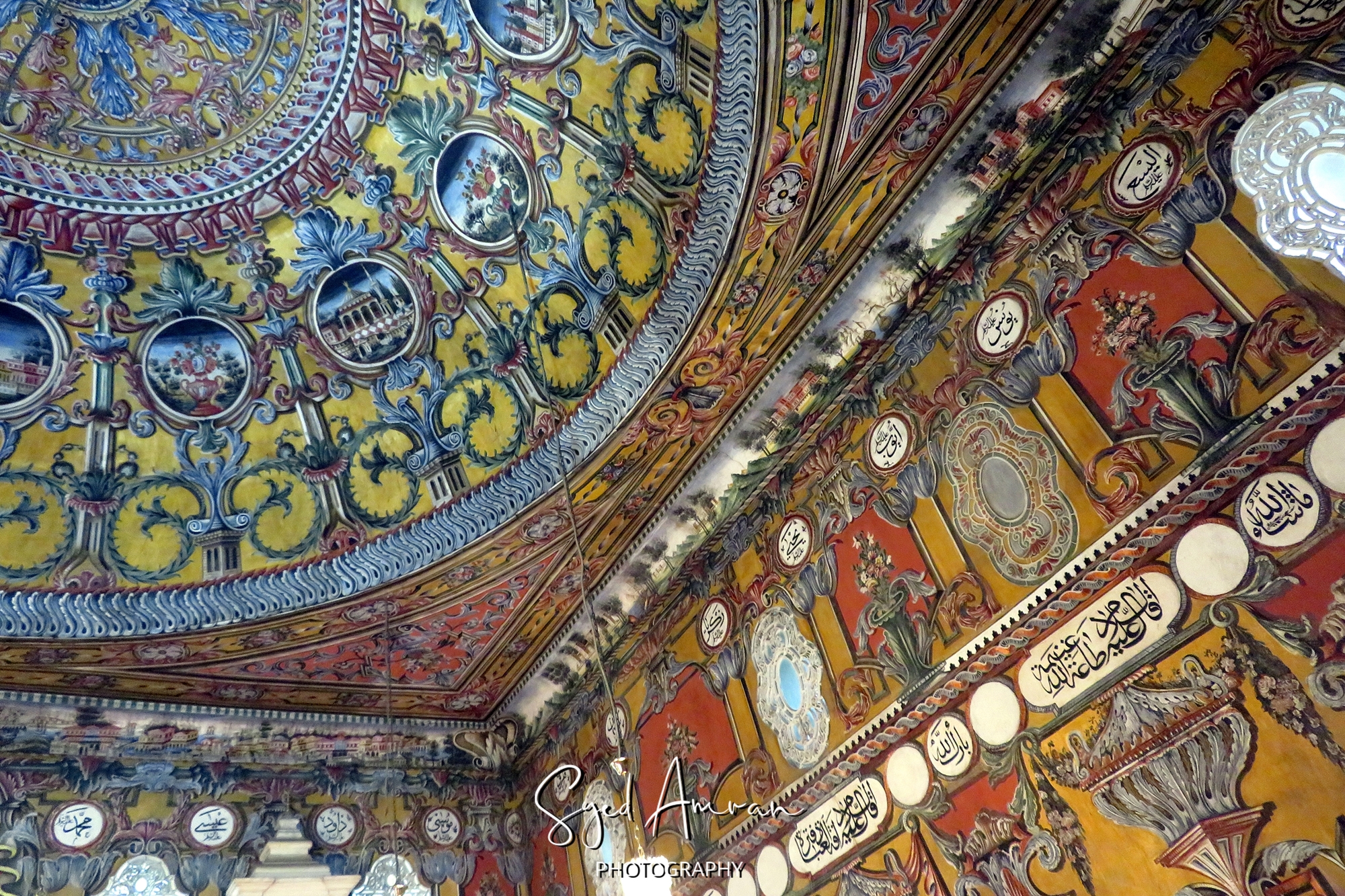 Selain hiasan geometri dan bunga serta tumbuh-tumbuhan, lukisan-lukisan landskap bandar dan bangunan-bangunan juga dapat kita lihat terutamanya pada bahagian dalam kubah dan pada penjuru siling.