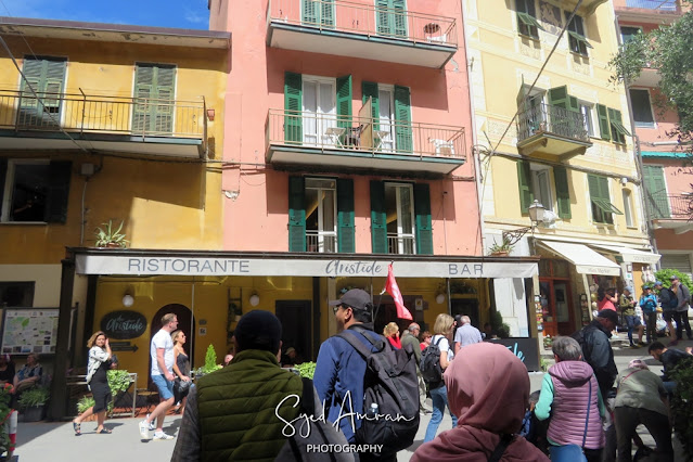 Lepas melalui terowong yang menembusi bukit tepi laut dari Stesen tren Manarola, kami pun tiba di pekan Manarola ini. Kami terus dihidang dengan pemandangan bangunan-bangunan berwarna warni ini.